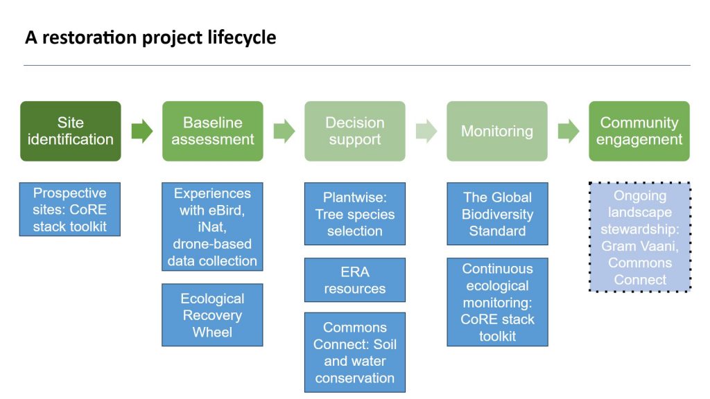 A few us organized a workshop at the Restoring Natural Ecologies conference in Guwahati last week. We organized the restoration process in stages of site identification -> baseline assessment -> decision support -> monitoring -> community engagement, and discussed several pieces of ongoing work and experiences with digital tools at each stage.
